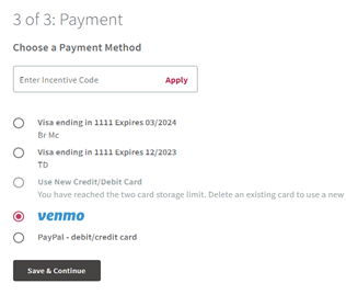 Clicking the “Save and Continue” button will cause the following Venmo button to appear.