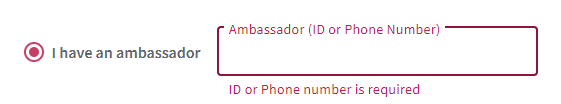 Si eres un Embajador de la Marca y tu Cliente Potencial no está usando o no puede usar tu enlace de referencia, haz que ingrese tu ID de Embajador o número de teléfono en la página de pago.
