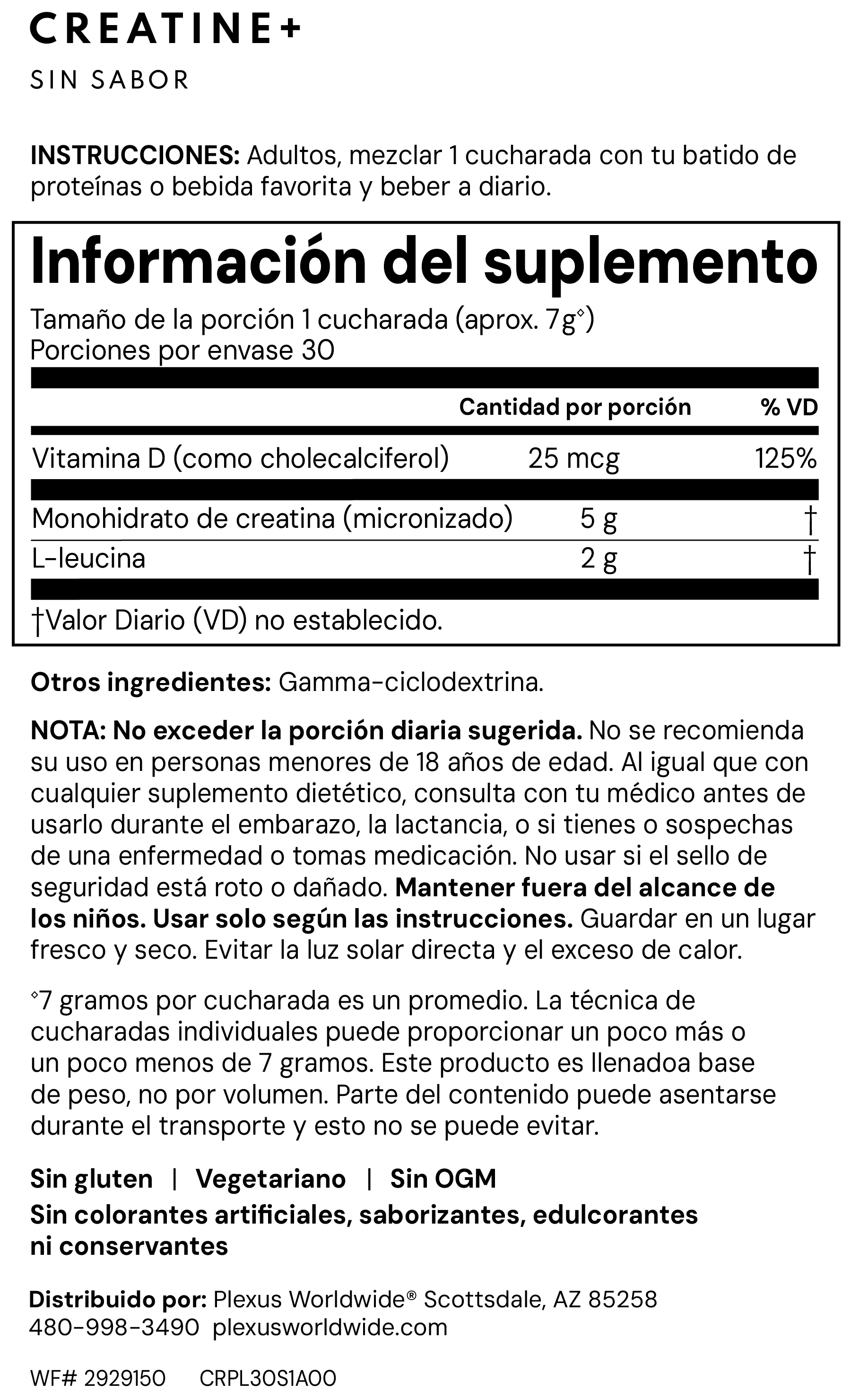 - Sin sabor (sabor neutro), la creatina monohidratada micronizada se mezcla suavemente en agua o Plexus Lean, Active, Hydrate o Slim—sin grumos ni sedimentos.