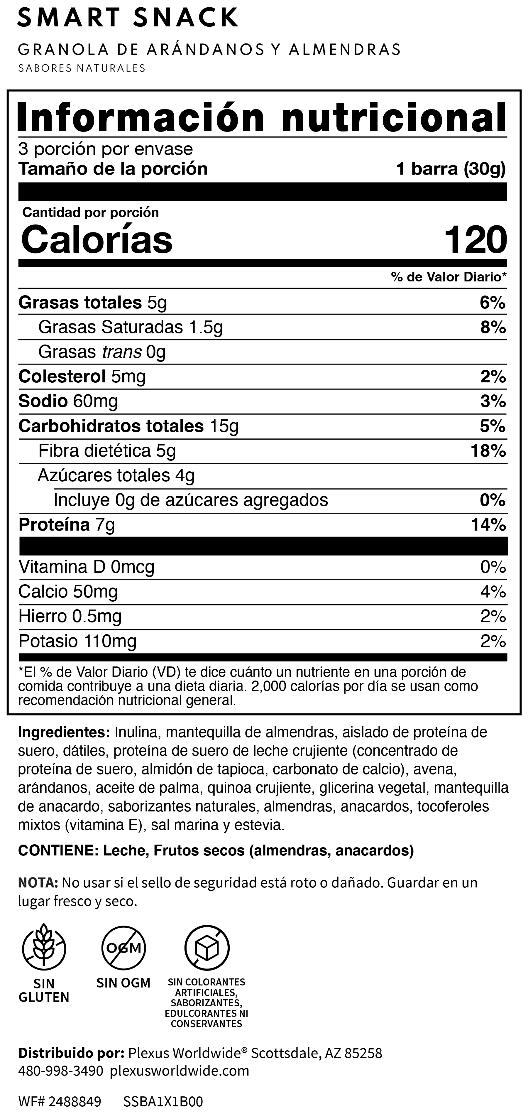 | Fecha de vencimiento | El Plexus Smart Snack tiene una vida útil de 12 meses a partir de la fecha de fabricación. La fecha de fabricación (MFG) se puede encontrar en la parte posterior del empaque de Smart Snack. |